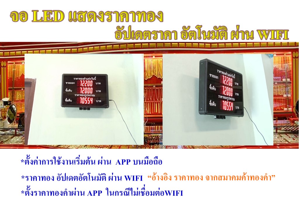 ป้ายแสดงราคาทองดิจิตอล ตั้งค่าข้อมูลเริ่มต้นผ่าน App บนมือถือ ไม่ต้องเปลี่ยนราคาทองเอง อัปเดตราคาทองอัตโนมัติ ผ่าน WIFI