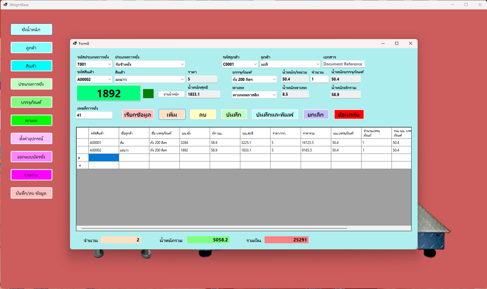 -สร้างบันทึกข้อมูล ลูกค้า, สินค้า, ประเภทการชั่ง, น้ำหนักภาชนะ, น้ำหนักพาเลส